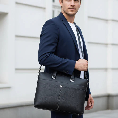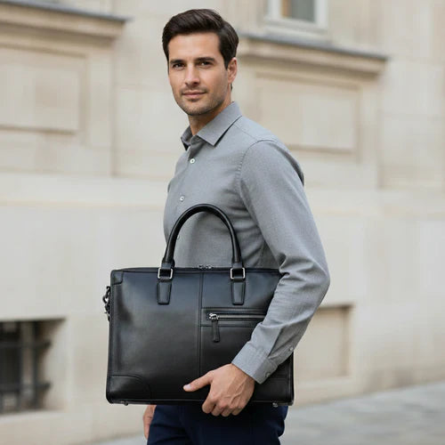 Ordinateur, documents, chargeur, téléphone. Les porte-documents en cuir véritable sont conçus pour organiser l'essentiel du quotidien professionnel — sans encombrement, sans compromis sur la qualité des matières.